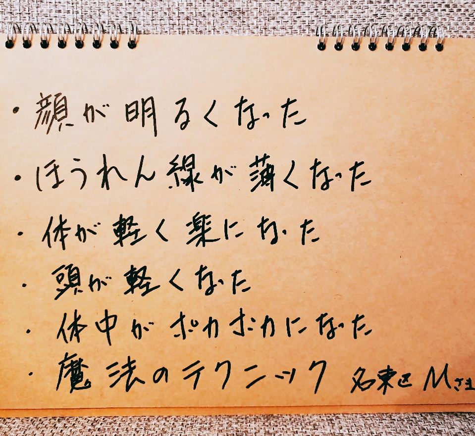 緑区 K様 オープン前 60分整膚体験 雅美先生に癒されて体が軽くなりました。 肩こりがひどかったのが軽くなって、 雅美先生とおしゃべりしながらの時間が とても楽しかったです。